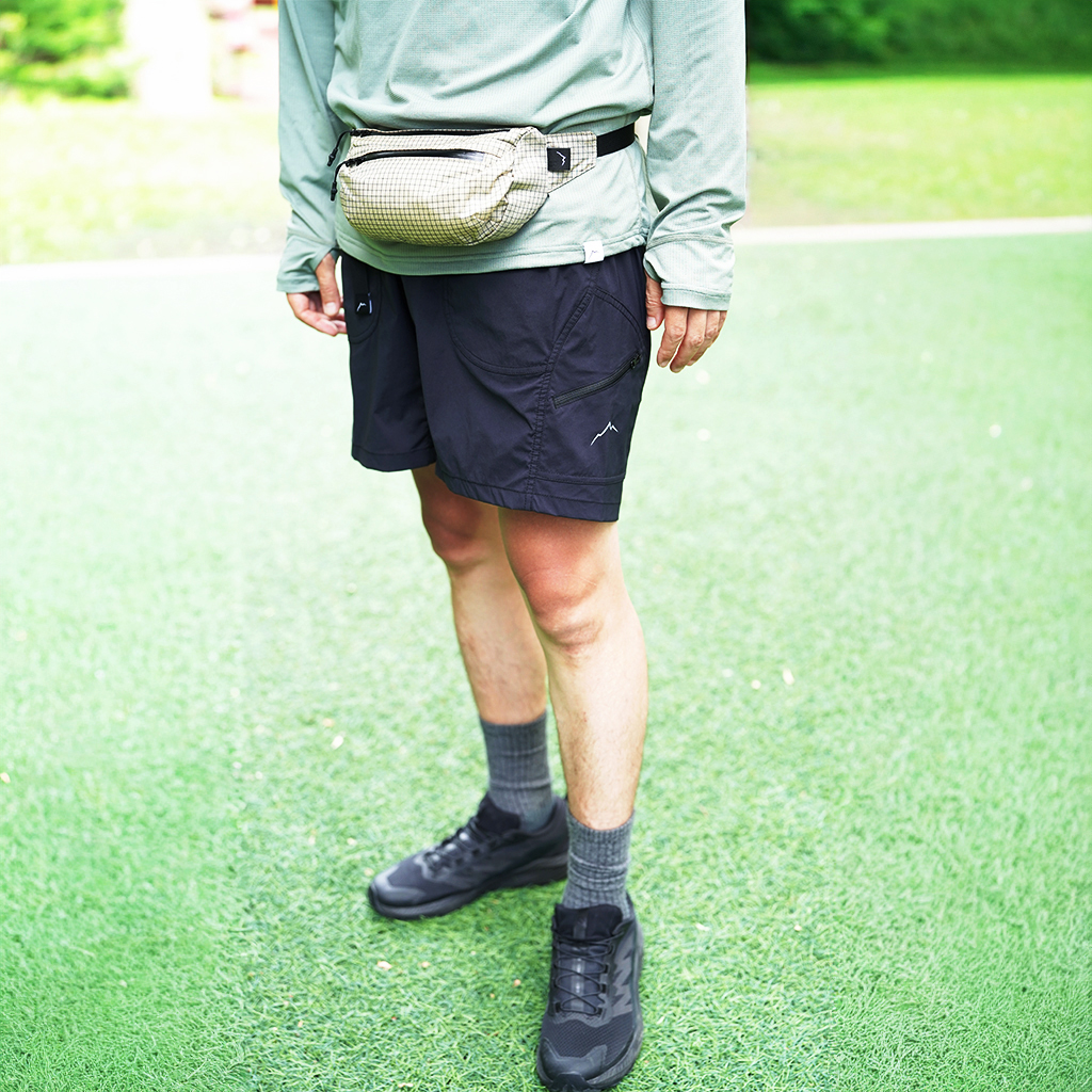 CAYL『6 Pocket Hiking Shorts』は、ストレッチ性、速乾性に優れるナイロンを採用したハイキングショーツ。 計6か所の収納ポケットを備え、両サイドと背面は鍵や財布などの貴重品も安心して収納できるジッパーポケットになっています。 ウエストはゴムとウェビングベルトで直感的に絞り具合を調整可能。腰上で留めてアクティブに動いたり、食事などリラックスしたい時は緩めたり。 撥水コーティングも施され、街でも山でも使いやすい、アクティブに使えるショートパンツです。 カラーは、Black、Khaki、Olive、Beige、Light Greyの5カラー展開です。 背面。 モデル:179cm/Lサイズ モデル:182cm / Lサイズ