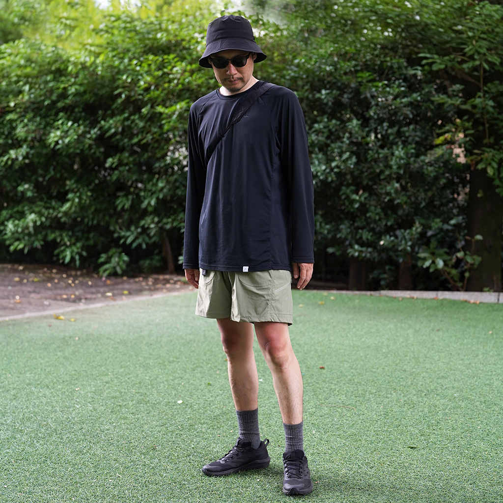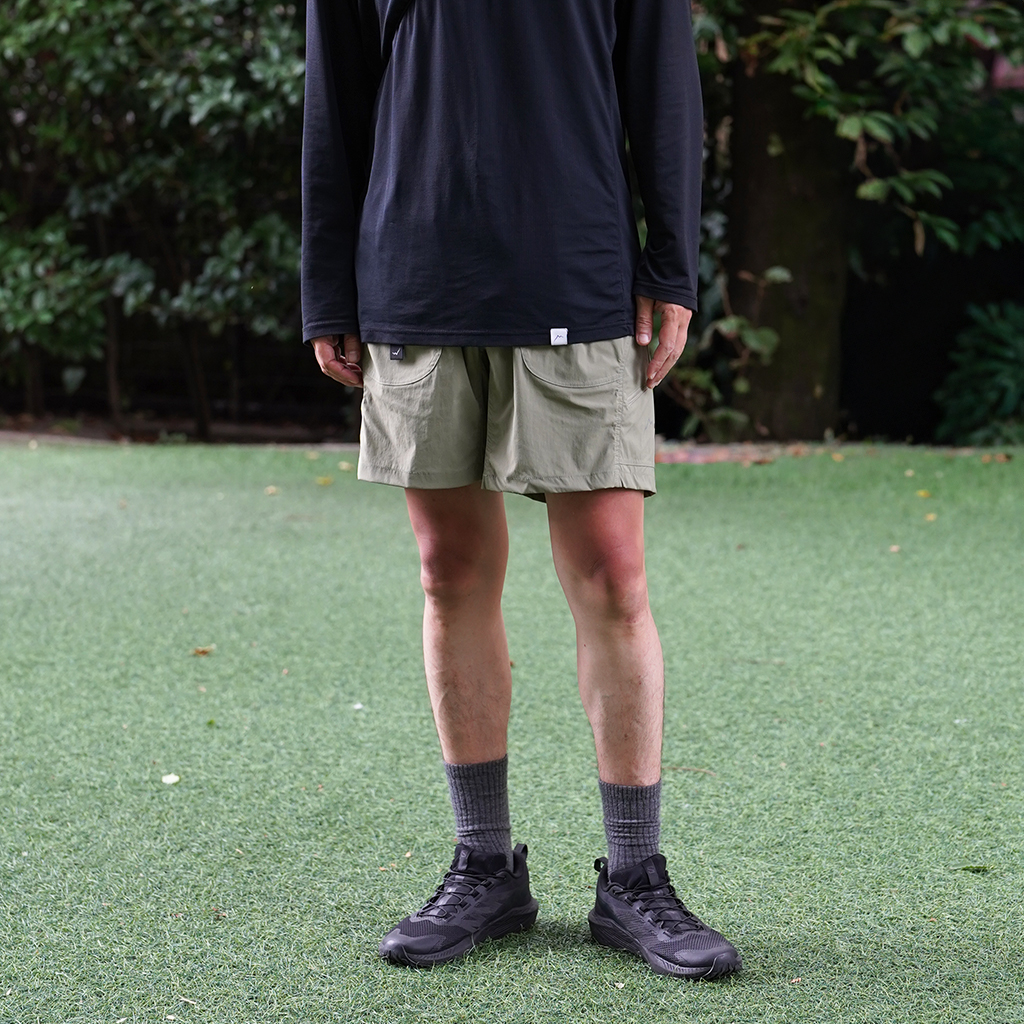 CAYL『6 Pocket Hiking Shorts』は、ストレッチ性、速乾性に優れるナイロンを採用したハイキングショーツ。 計6か所の収納ポケットを備え、両サイドと背面は鍵や財布などの貴重品も安心して収納できるジッパーポケットになっています。 ウエストはゴムとウェビングベルトで直感的に絞り具合を調整可能。腰上で留めてアクティブに動いたり、食事などリラックスしたい時は緩めたり。 撥水コーティングも施され、街でも山でも使いやすい、アクティブに使えるショートパンツです。 カラーは、Black、Khaki、Olive、Beige、Light Greyの5カラー展開です。 背面。 モデル:184cm / Lサイズ モデル:182cm / Lサイズ