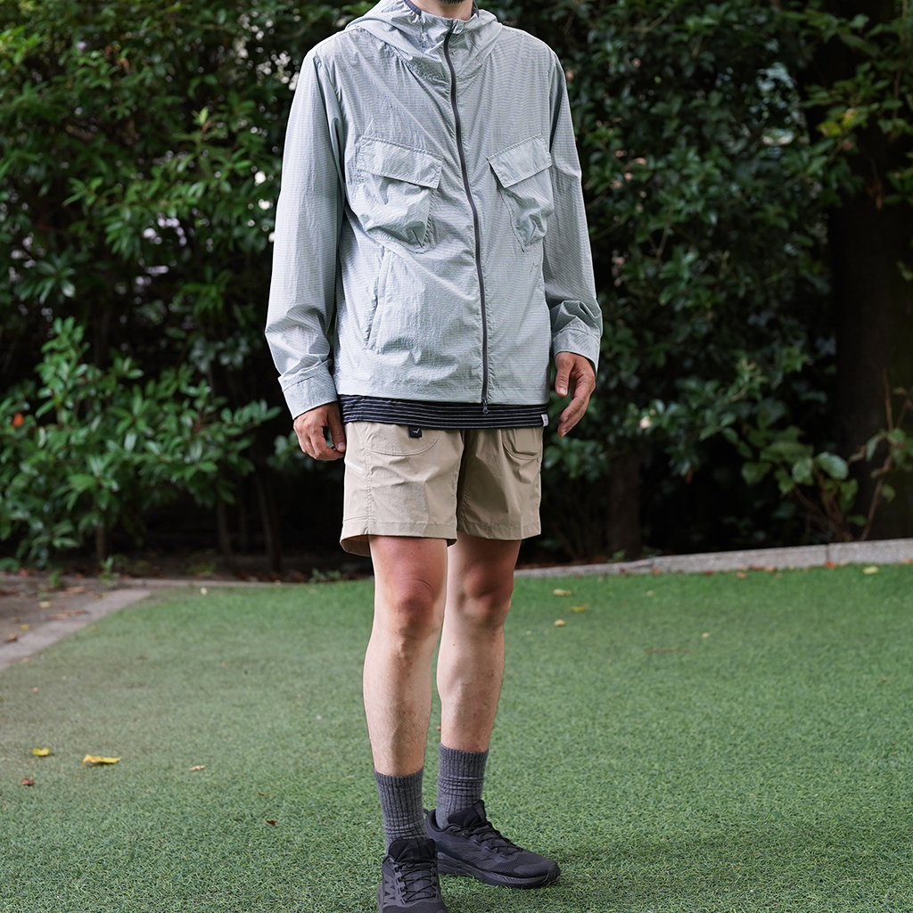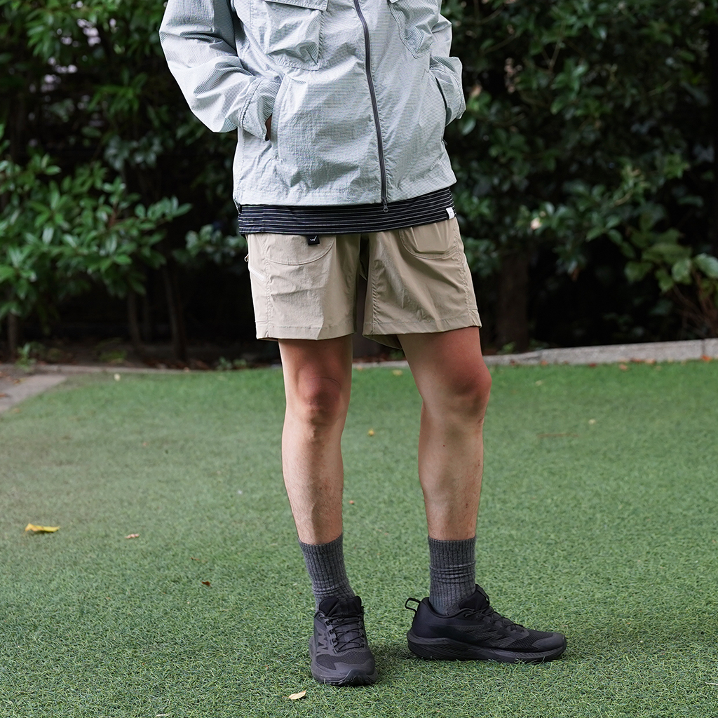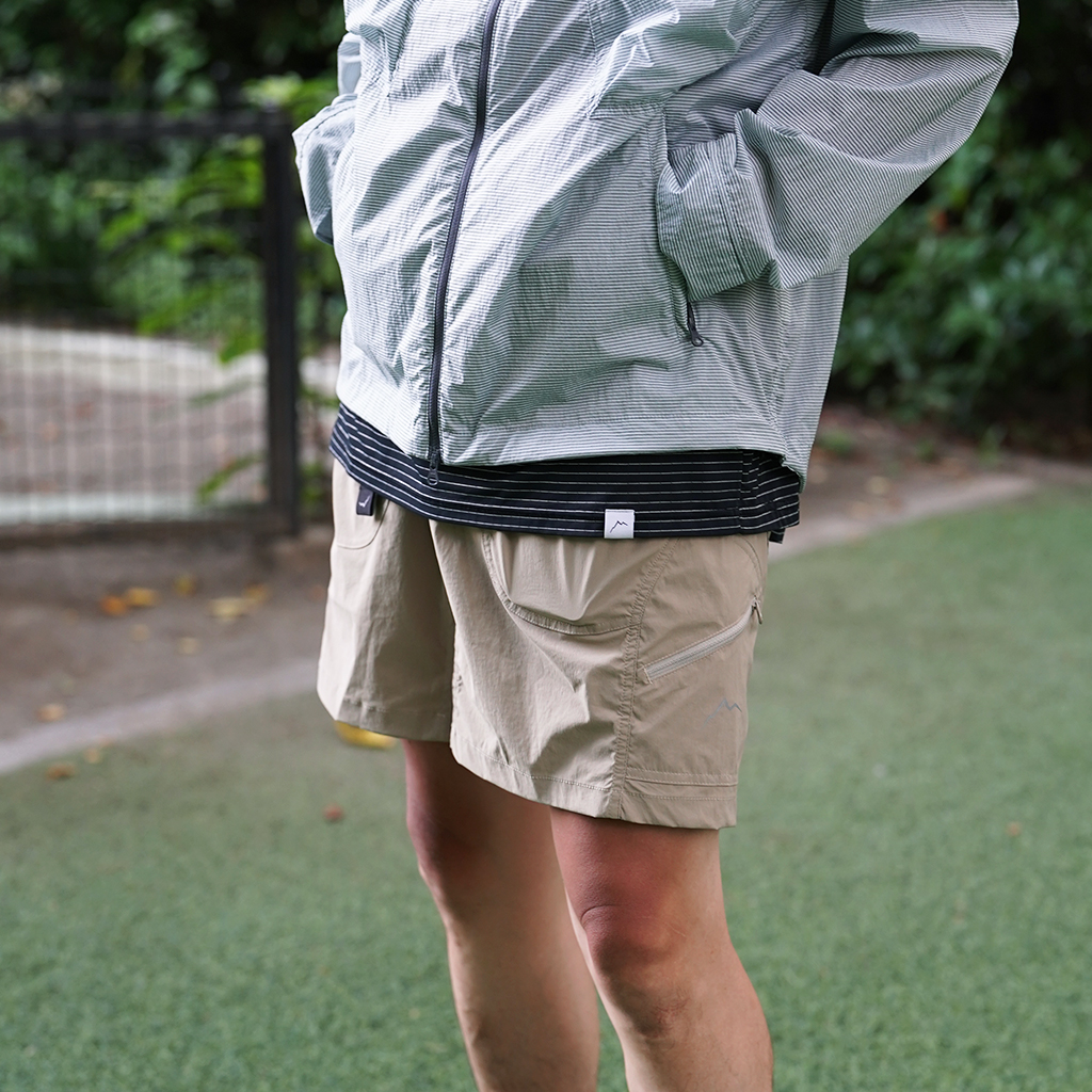 CAYL『6 Pocket Hiking Shorts』は、ストレッチ性、速乾性に優れるナイロンを採用したハイキングショーツ。 計6か所の収納ポケットを備え、両サイドと背面は鍵や財布などの貴重品も安心して収納できるジッパーポケットになっています。 ウエストはゴムとウェビングベルトで直感的に絞り具合を調整可能。腰上で留めてアクティブに動いたり、食事などリラックスしたい時は緩めたり。 撥水コーティングも施され、街でも山でも使いやすい、アクティブに使えるショートパンツです。 カラーは、Black、Khaki、Olive、Beige、Light Greyの5カラー展開です。 背面。 モデル:184cm / Lサイズ モデル:182cm / Lサイズ