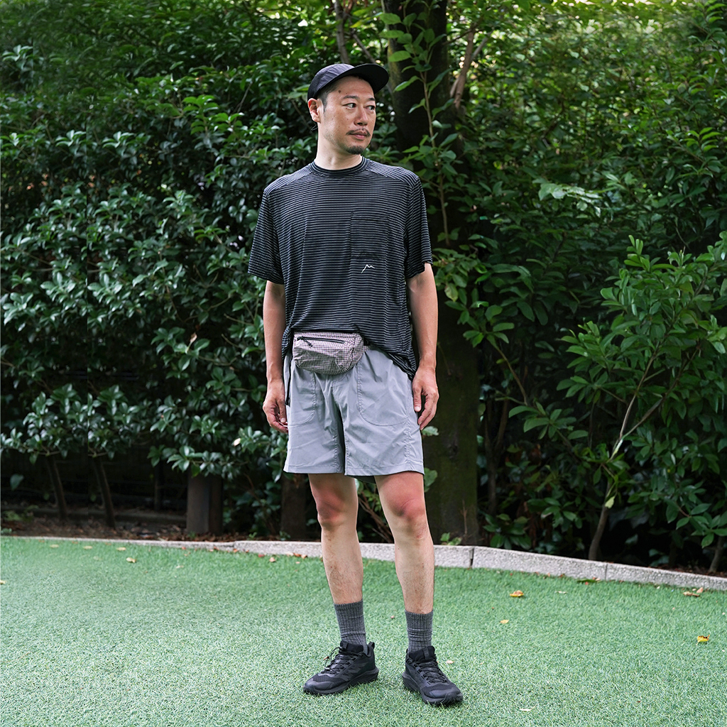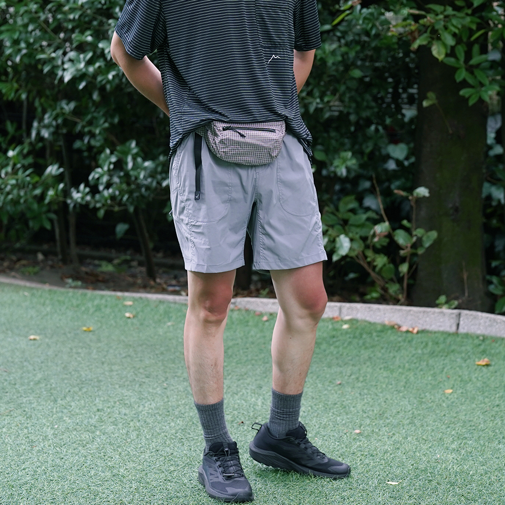 CAYL『6 Pocket Hiking Shorts』は、ストレッチ性、速乾性に優れるナイロンを採用したハイキングショーツ。 計6か所の収納ポケットを備え、両サイドと背面は鍵や財布などの貴重品も安心して収納できるジッパーポケットになっています。 ウエストはゴムとウェビングベルトで直感的に絞り具合を調整可能。腰上で留めてアクティブに動いたり、食事などリラックスしたい時は緩めたり。 撥水コーティングも施され、街でも山でも使いやすい、アクティブに使えるショートパンツです。 カラーは、Black、Khaki、Olive、Beige、Light Greyの5カラー展開です。 背面。 モデル:179cm/Lサイズ モデル:182cm / Lサイズ