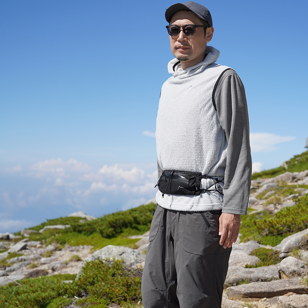 トレランを楽しむCAYLが提案する『GTD Belt』は、コンパクトながら多彩な収納スペースで、ユーザーの好みに合わせて使い分けることができるランニングベルト。 前後に収納スペースがあり、右側のバックルで簡単に着脱できます。 フロント側には4つの収納スペース(ジッパーポケット×3、オープンポケット×1)、バック側には2つの収納スペース(ジッパーポケット×1、オープンポケット×1)、さらにバック側にはウェアやポールを外付けできるストリングコードも備えます。 付属のストリングコードで、ゼッケンベルトとしても使えます。 単体での使用はもちろん、トレランパックと組み合わせての使用もオススメ。 GTDはGo The Distanceの略で、諦めず最後までやり遂げることを意味しています。 ※こちらの商品には、HydraPakにCAYLが別注した250mlのソフトフラスクがセットになっています。 ■フィッティング方法 1. 右側のバックルをはめる 2. 左右のストリングコードでサイズ調整する 3. フロントセンターにあるメインストリングを引っ張り、身体側に引き寄せる 4. フロントポケットの左右にある補助ストリングを外側に引っ張り、身体側に引き寄せる バック側。 ソフトフラスクの収納に適したフロント側のオープンポケット。 使用イメージ。 ゼッケン装着用ストリングコードが2本付属します。 ゼッケン装着イメージ。 ■フィッティング方法 1. 右側のバックルをはめる 2. 左右のストリングコードでサイズ調整する フロントセンターにあるメインストリングを引っ張り、身体側に引き寄せる トレランを楽しむCAYLが提案するコンパクトながら多彩な収納スペースで、ユーザーの好みに合わせて使い分けることができるランニングベルトです。